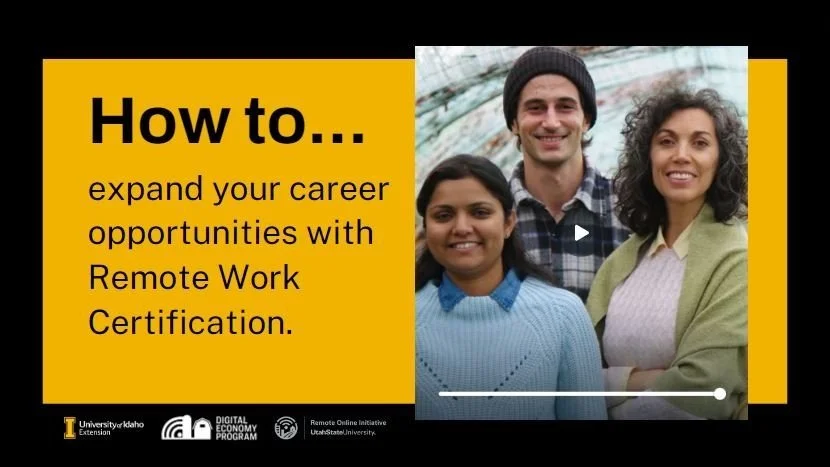 This four-week, online course offers comprehensive training for Idaho residents interested in thriving as remote workers, online freelancers, or e-commerce entrepreneurs. Dive into topics such as typical work-from-home routines, communication skills, critical thinking in remote settings, and much more. Sign up today for the Remote Work Professional Certificate training and take the next step in your career journey!